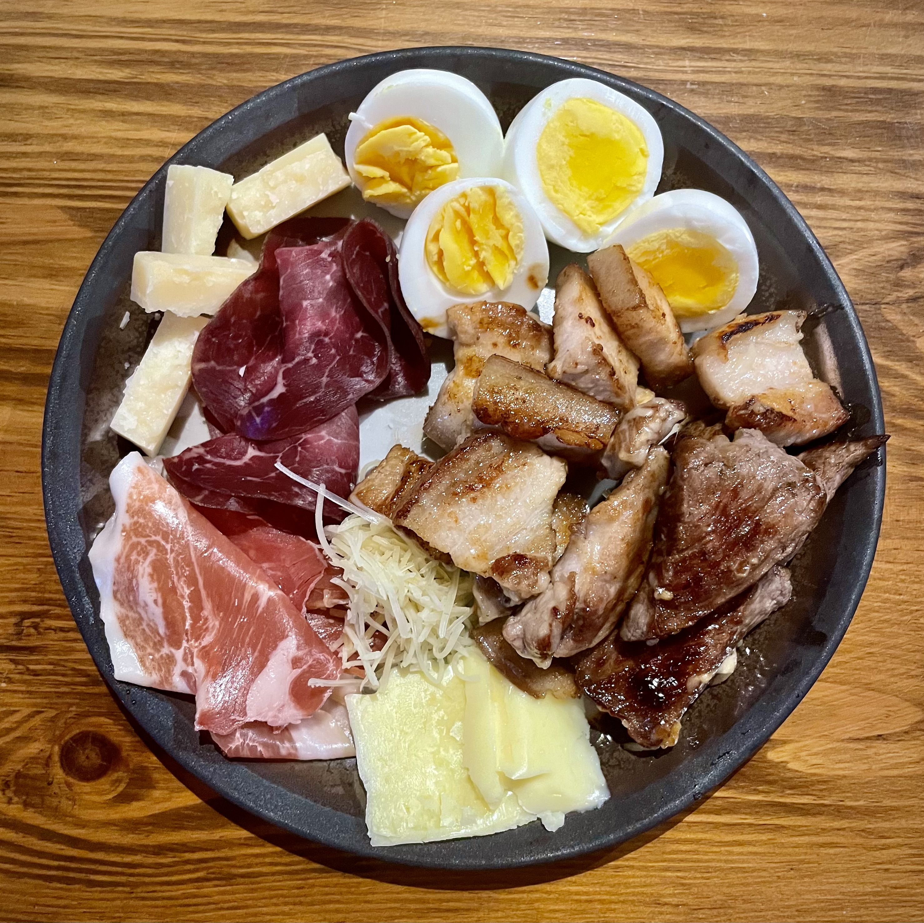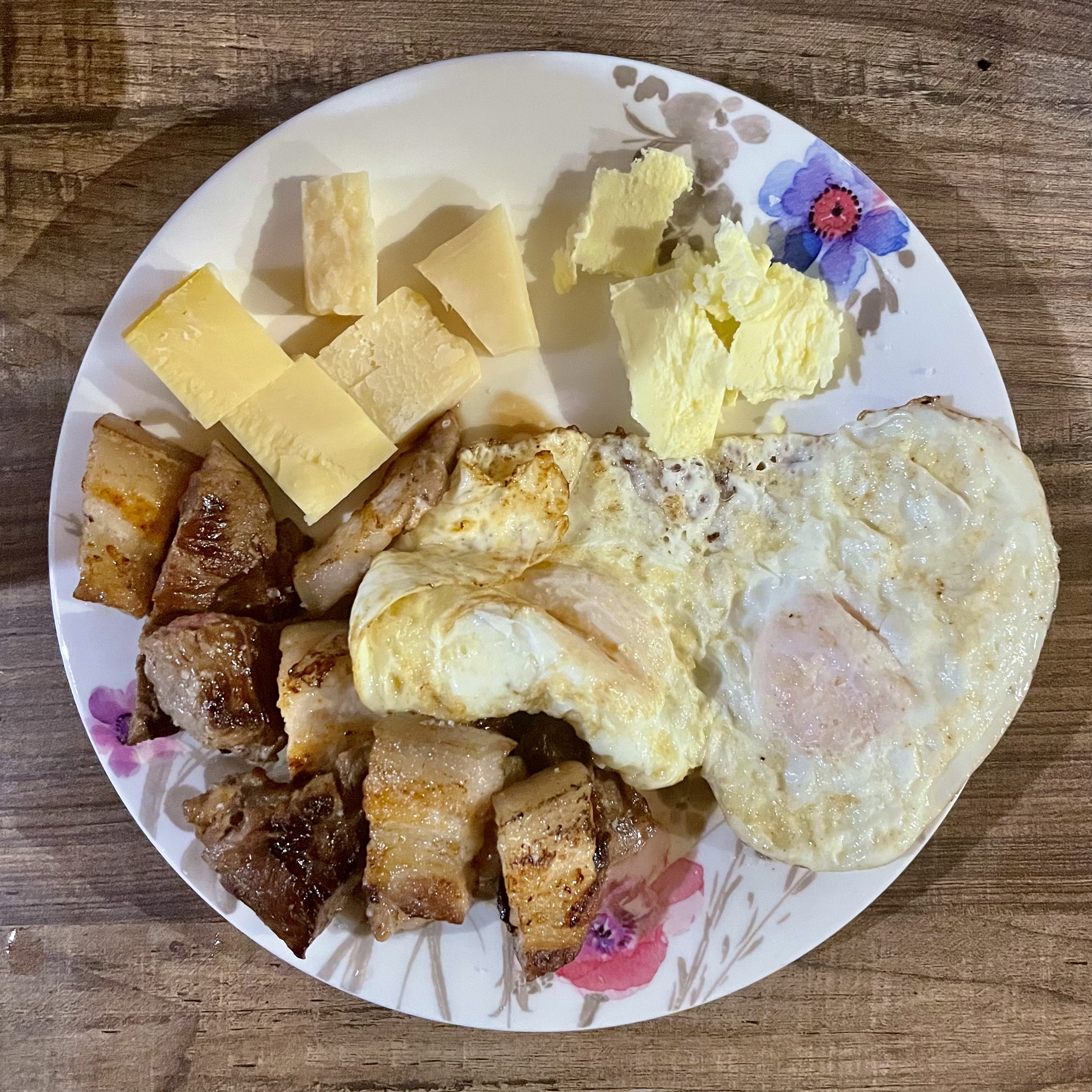첫끼로 먹은 고다치즈와 파마산치즈, 계란 프라이 2개, 삼겹살, 버터.
