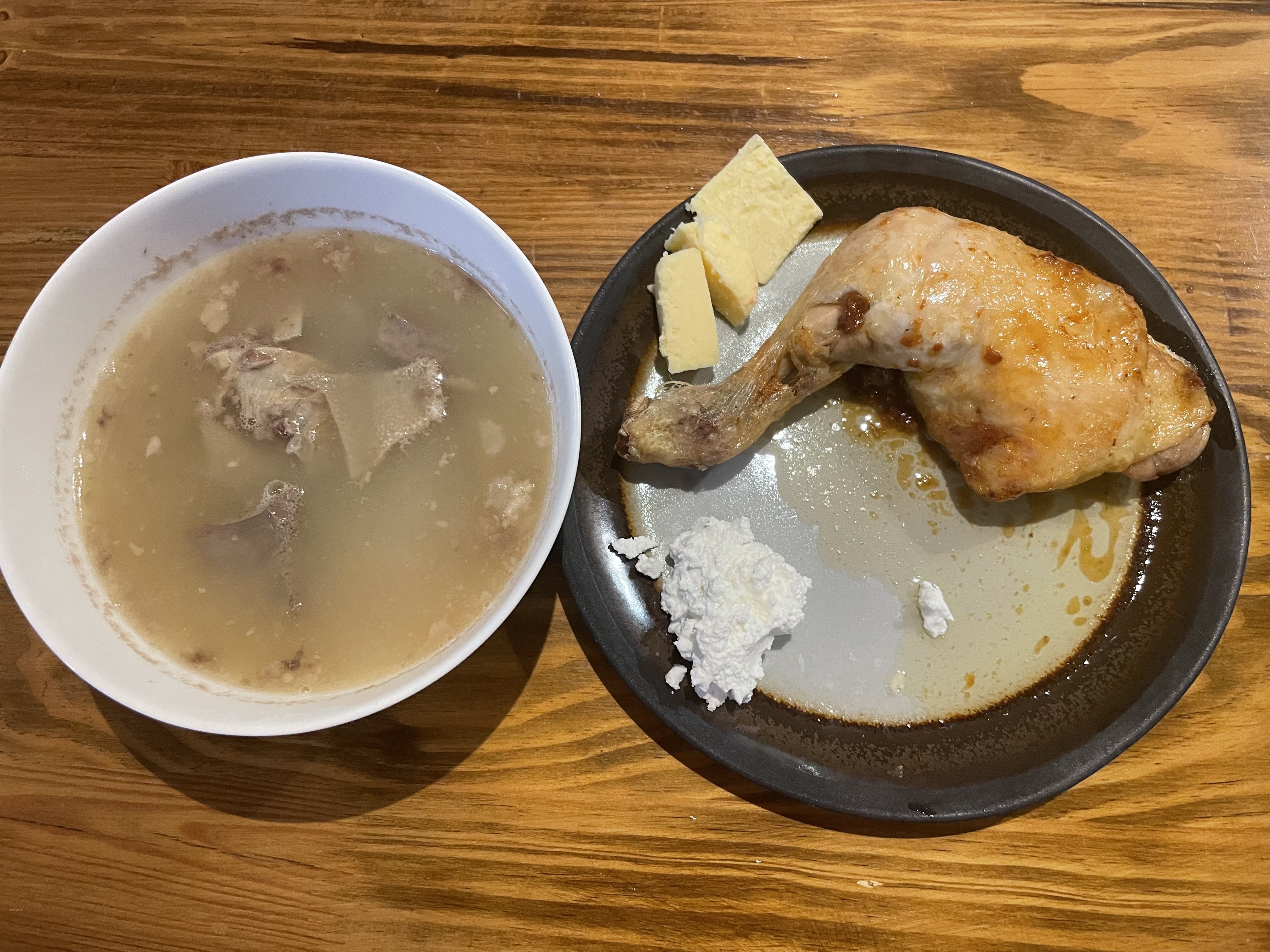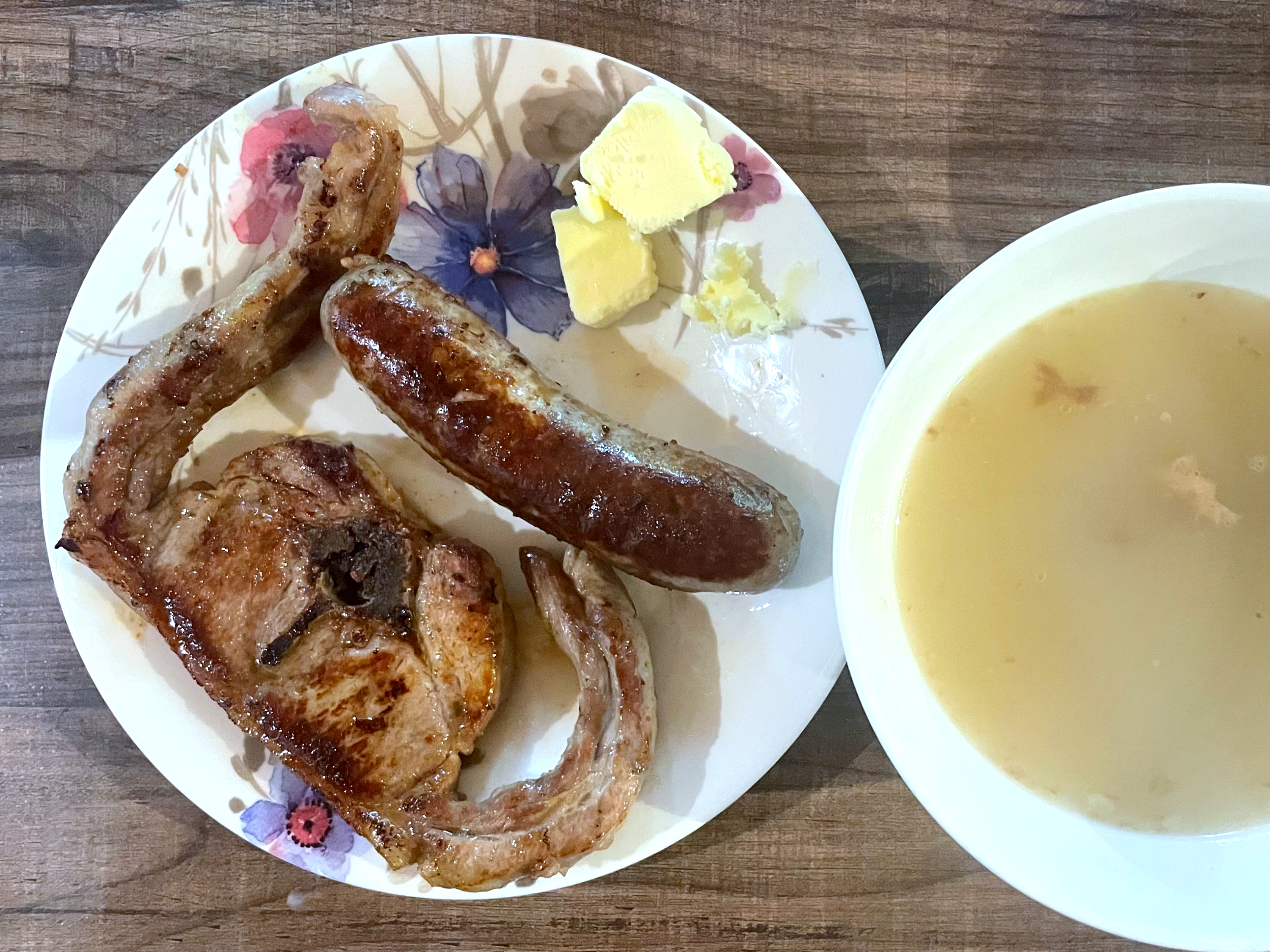 점심으로 먹은 양고기와 돈육 소시지, 버터와 냉동고에 얼려뒀던 곰탕.