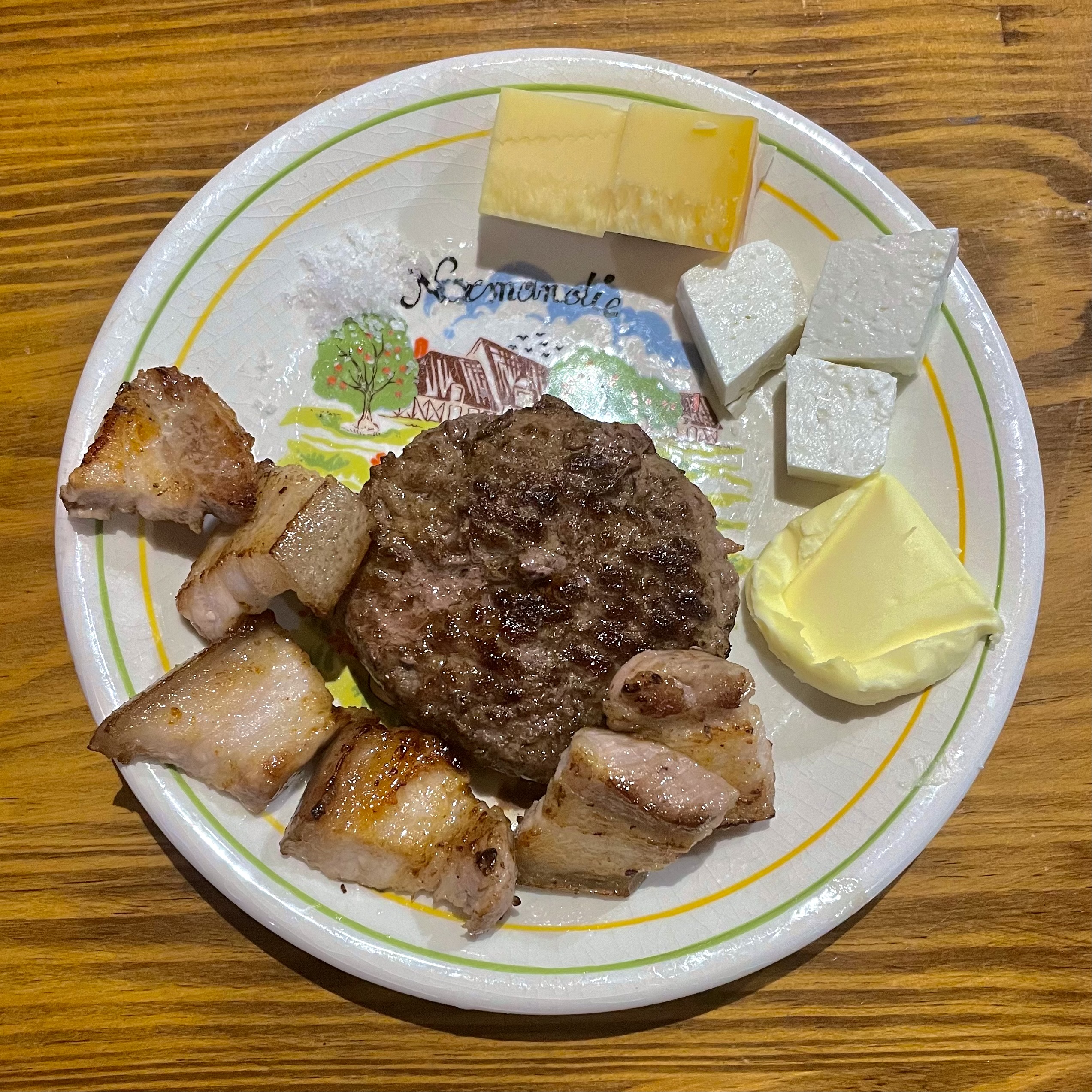 저녁 7시 조금 넘어서 먹은 다진 소고기 패티와 삼겹살, 버터, 소금, 페타 치즈, 스위스치즈.